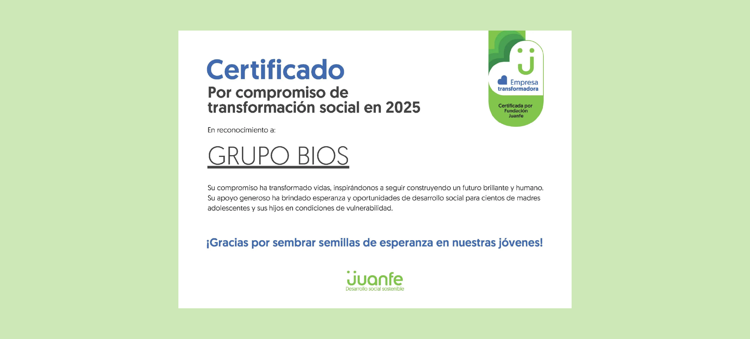 Con orgullo y gratitud compartimos que Grupo Bios ha sido reconocida como Empresa Transformadora 2025 por la Fundación Juanfe, gracias a nuestro compromiso con la construcción de un futuro más humano, justo y lleno de oportunidades para quienes más lo necesitan.